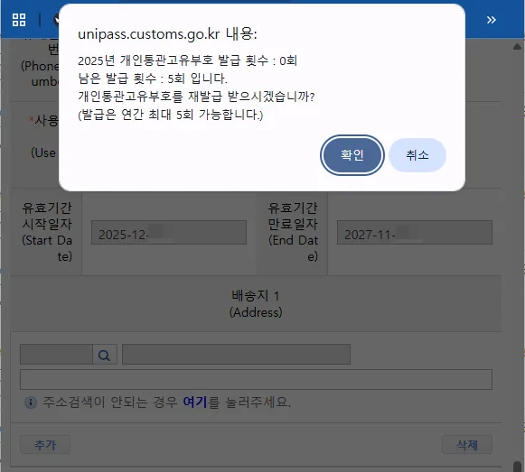 개인통관고유부호는 1년간 최대 5회까지 재발급이 가능하며, 재발급 시 기존 개인통관고유부호의 조회·사용이 중지되니 유의하도록 한다.