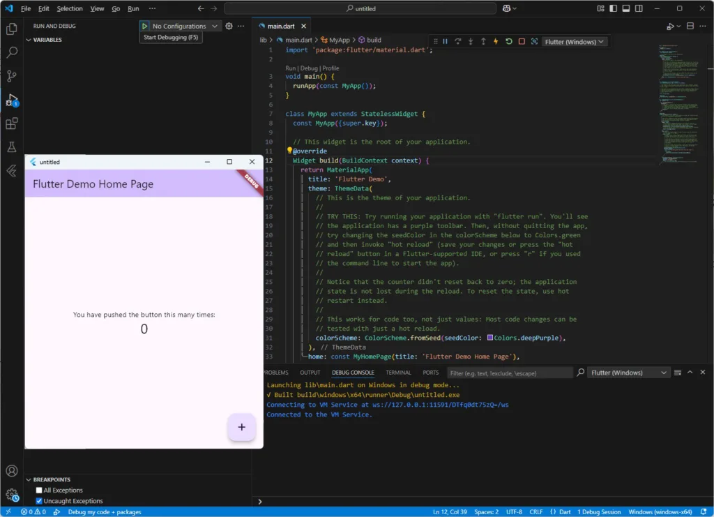 비쥬얼 스튜디오 코드를 실행하고 앞서 안드로이드 스튜디오에서 생성한 프로젝트 폴더를 선택하여 연다. 메뉴에서 Run>Start Debugging (F5)를 선택하면 플러터 앱이 실행된다.
