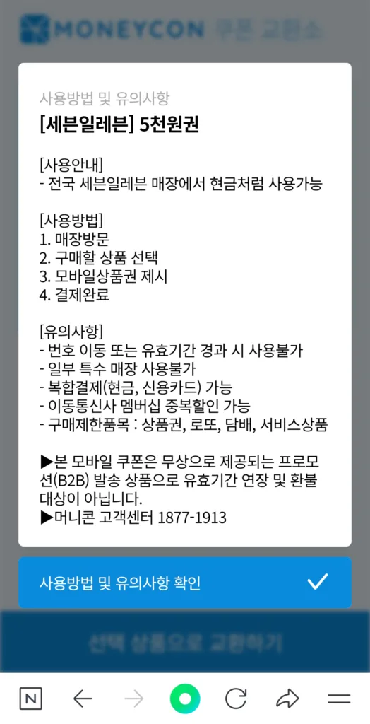 인증이 완료되면 원하는 상품(편의점)을 선택하고 사용방법 및 유의사항을 확인하고 버튼을 터치한다.